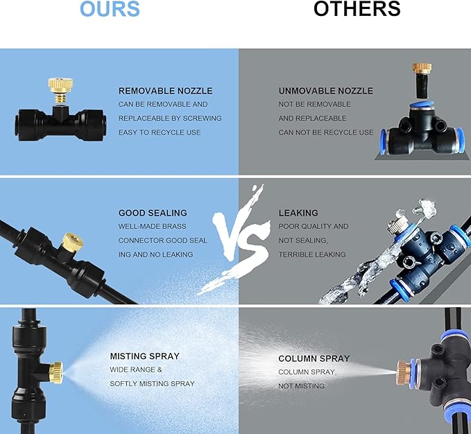 - 💧【Durable and Leak-Proof Misting Nozzles】: The Bonviee Misting System is equipped with brass misting nozzles that provide a smooth and consistent spray. These nozzles are brass to ensure long-lasting durability. The system’s no-leak design ensures optimal performance, making it perfect for misting cooling systems in backyards, patios, or greenhouses.
