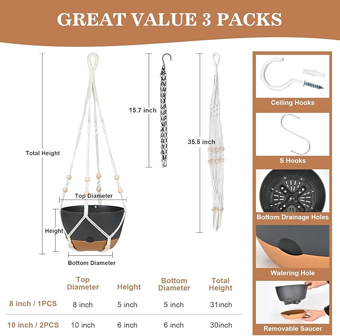 - 【GREAT VALUE PACK】 - Each package includes 3pcs macrame plant hangers and chain plant hangers, 3pcs plastic selfwatering plant pots and saucers 8" / 10" / 10", and 3pcs ceiling and s hooks.