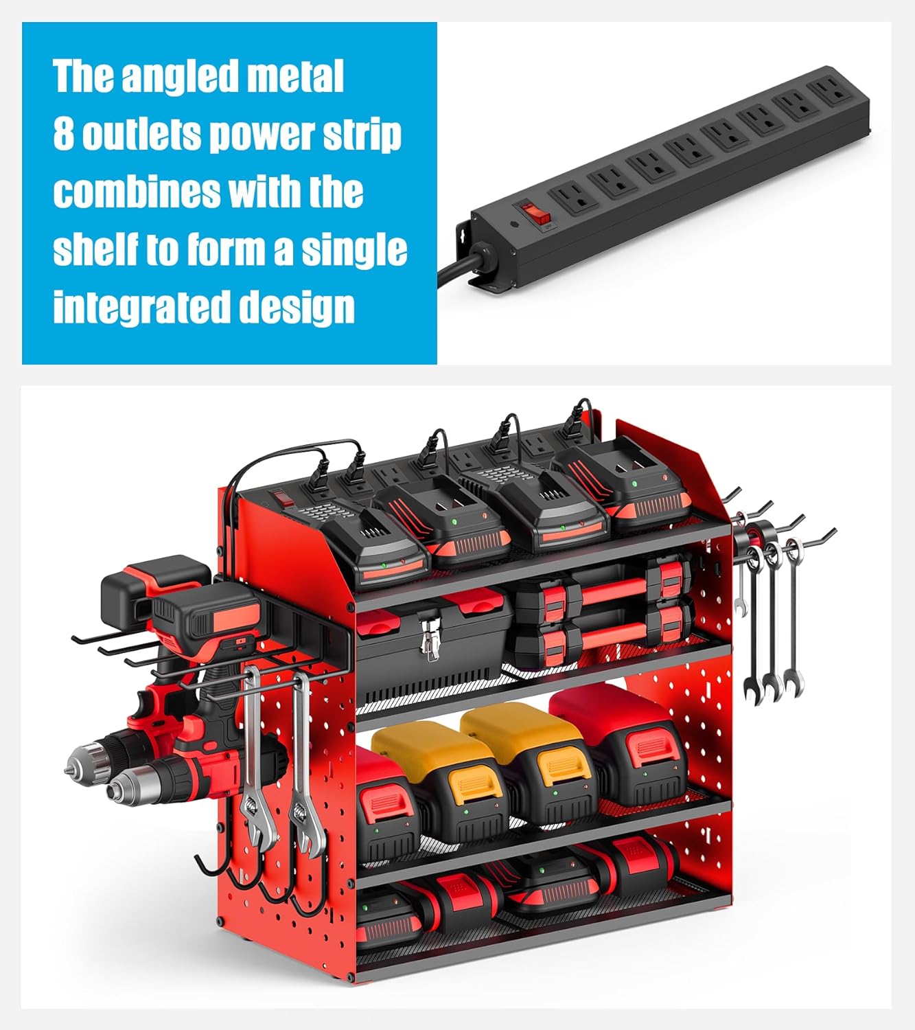 CCCEI Modular Desk Power Tools Organizer with Charging Station, 4 Layer Drills Battery Storage Wall Mount, Garage Shop Organization, Anniversary, Birthday, Gifts for Men, Father, Red, 6FT Cord.