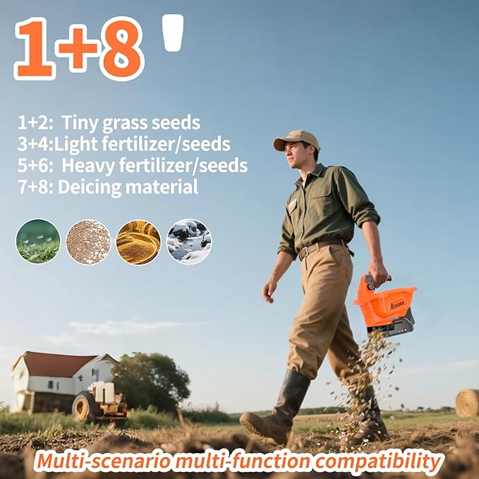 - 【8-Level Settings & 6 Seeding Angles for Precision】This grass seed spreader features 8 adjustable settings: Levels 1-3 are ideal for fine grass seeds, Levels 4-6 for moderate fertilizers, and Levels 7-8 for heavy rock salts. It also offers 6 seeding angles with a maximum of 125°, ensuring precise spreading.