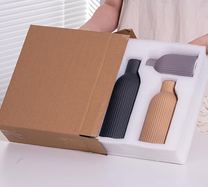 - Unique Ribbed Design : Featuring a distinctive ribbed texture and a warm brown finish,these vases bring a modern yet timeless aesthetic to your home.The vertical grooves create a visually striking pattern , making them ideal for farmhouse , pampas grass decor styles.οΌLength x Diameter=9.96 x 3.35", 7.87 x 3.31",5.79 x 3.31",the dimensions are all measured by hand , So there may be some small deviations.)
