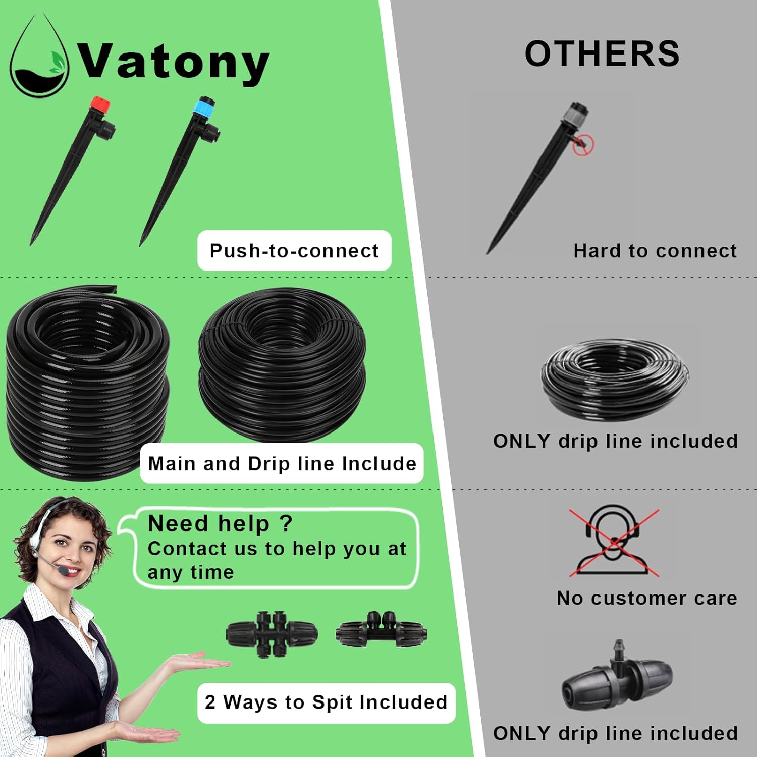 - 🔧【Plug & Play with Quick Connect Design】 : Featuring quick-connect fittings, simply plug and secure for a hassle-free setup. The connectors ensure a firm grip, preventing leaks and detachment. With a detailed user manual, you can easily create the perfect irrigation branches using four-way, two-way, and one-way couplers, ensuring even water distribution and minimal evaporation loss. We includes Instruction manual in the package, you just need to connect main tubing to faucet and then connect the distribution tubings and emitters according your needs.