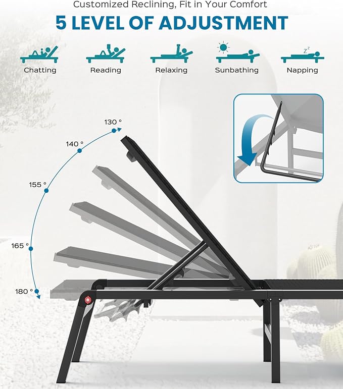 - 5-Position Adjustable Backrest –Experience ultimate comfort with our patio lounge chair’s five recline options. Whether you’re reading, napping, or simply relaxing, adjust the backrest from upright to fully reclined to find your perfect angle