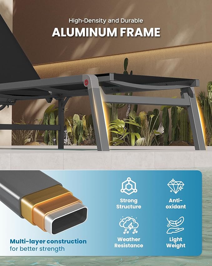 - Rust-Resistant Aluminum Frame – Built with a durable aluminum frame covered in an anti-rust powder coating, this pool lounge chair withstands outdoor elements. Its robust design provides longevity and low maintenance for carefree outdoor relaxation