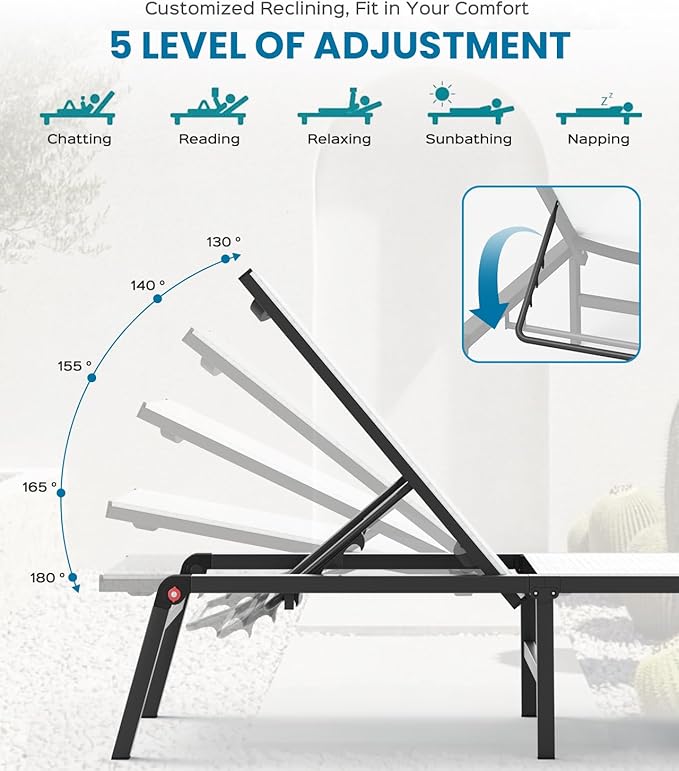 - 5-Position Adjustable Backrest –Experience ultimate comfort with our patio lounge chair’s five recline options. Whether you’re reading, napping, or simply relaxing, adjust the backrest from upright to fully reclined to find your perfect angle