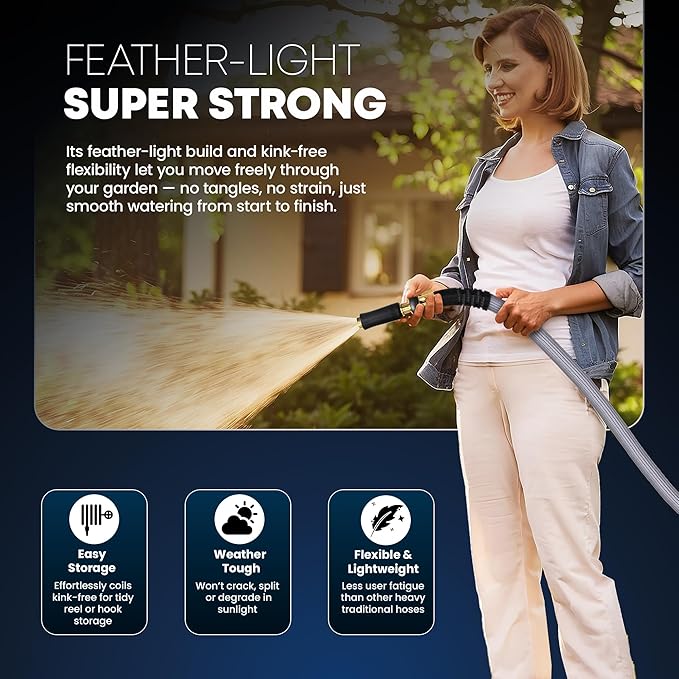 - [Feather-Light, Super Strong] Redefining watering with its incredibly lightweight design, experience unmatched watering efficiency with our Titan garden hose. When paired with our precision-engineered nozzle, this hose delivers exceptional pressure for everyday watering tasks while saving you water. Ideal for garden maintenance, vehicle cleaning, RV, marine use and more, for a powerful and consistent water flow.