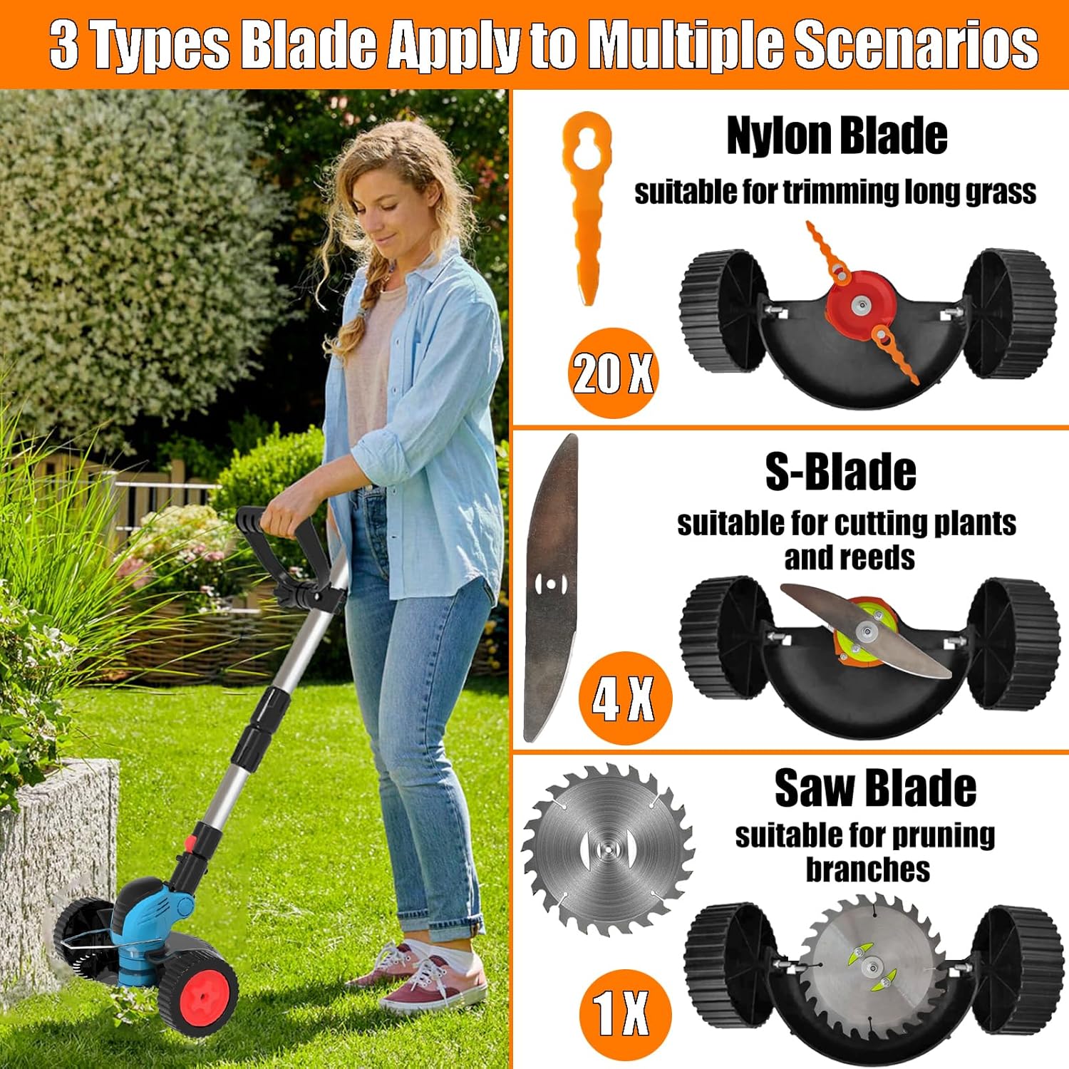 - 2025 UPGRADED ELECTRIC WEED WACKER: The cordless grass trimmer has been upgraded with smoother wheels, higher-strength blades and larger-capacity batteries.The multifunctional cordless electric weed wacker is versatile and can be used as grass trimmer, edger, lawn mower, easy for different cutting jobs, not limited by wires, you can mow anywhere. Weeding is as easy as walking and enjoy the fun of cutting.(fully charged before first use)