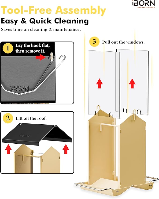 - 【Fully Detachable Design,Easy to Clean & Refill】iBorn squirrel proof bird feeders features a removable roof, foldable perches, and a wide opening for quick filling and effortless cleaning. The clear PC window lets you check seed levels at a glance. Every part is accessible — clean with just your hands, a brush, or towel. No hidden corners, no hassle. Perfect for bird lovers who want to enjoy nature without the mess.