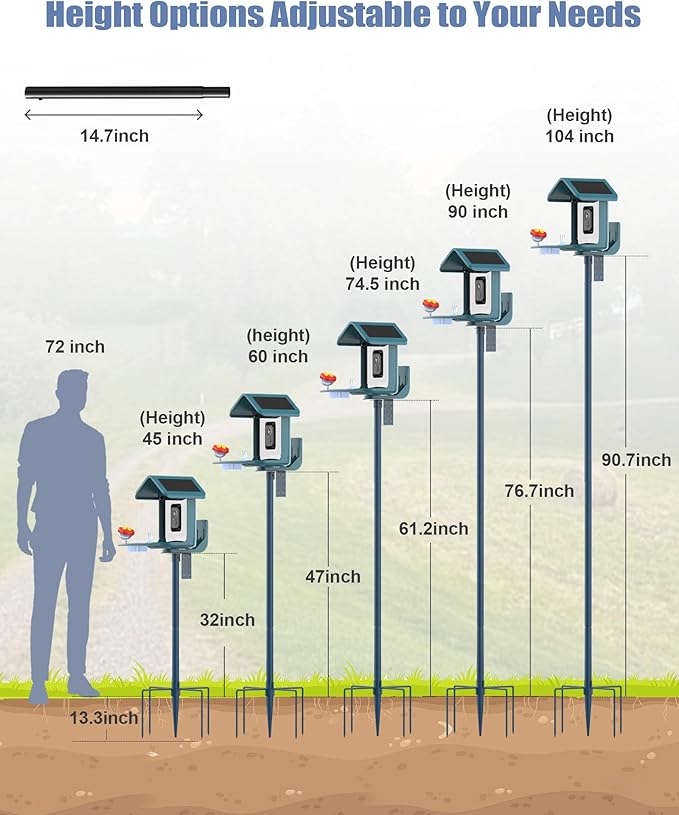 - 【Easy Installation】This bird feeding station reaches a total height of 104 inches and comes with 6.5-inch 5-prong base, 5 x connecting pole, and an L-shaped plate. The slip-in connection method allows for easy assembly, similar to stacking building blocks. Installation typically takes 20 to 40 minutes and no need extra tools. This user-friendly design ensures that anyone, from young enthusiasts to seniors, can set it up effortlessly.