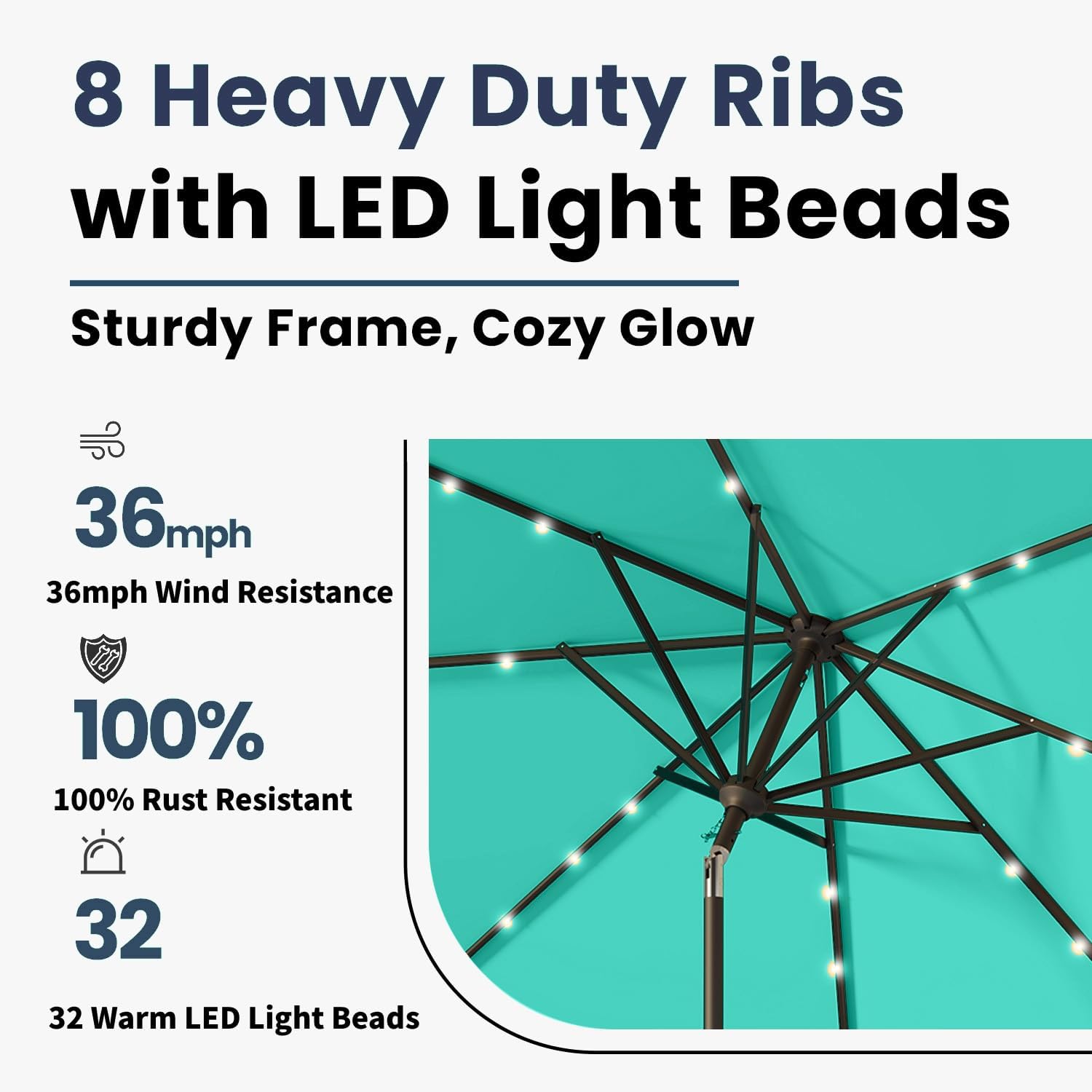 10FT Solar Umbrella 32 LED Lighted Patio Umbrella Table Market Umbrella w/Tilt and Crank, UV-Resistant Outdoor Umbrella for Pool, Garden, Deck, Turquoise Blue