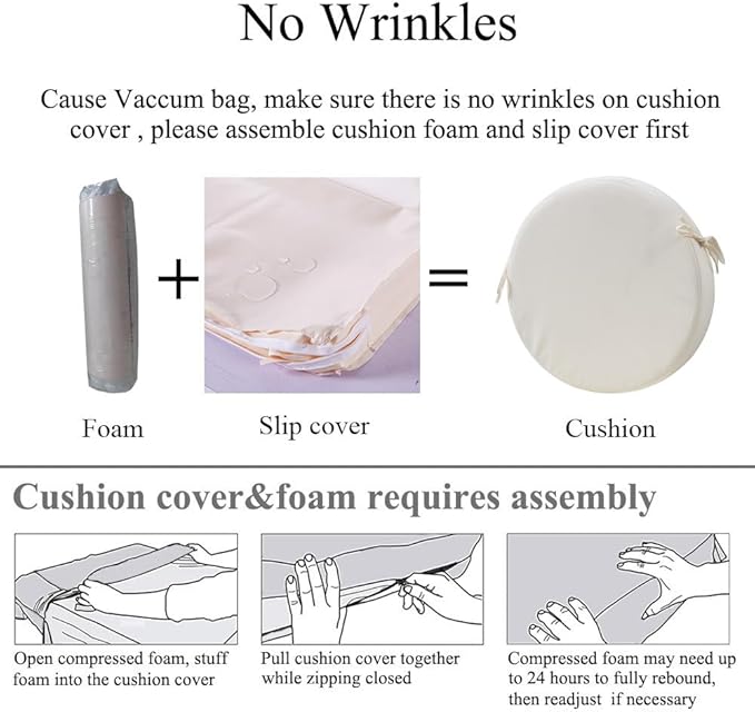 - 【Comfort & Support】 Experience ultimate comfort with the high density foam of these patio chair cushions set of 2. They provide excellent support for your hip, promoting good posture and allowing you to relax for extended periods of time. All outdoor dining chair cushions are packed with vacuum bag. You need to assemble cushion to make there is no wrinkles in cushion covers