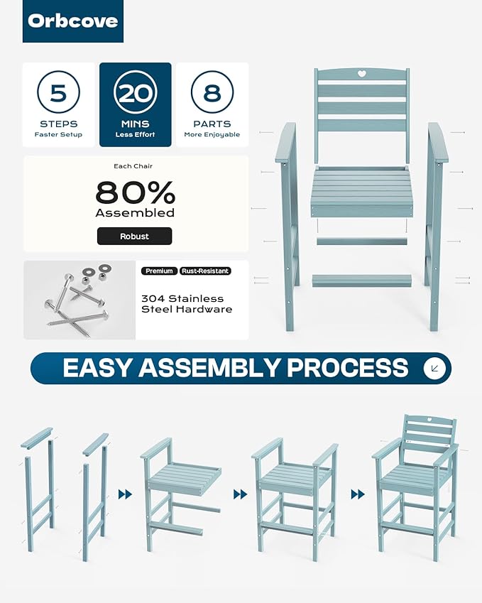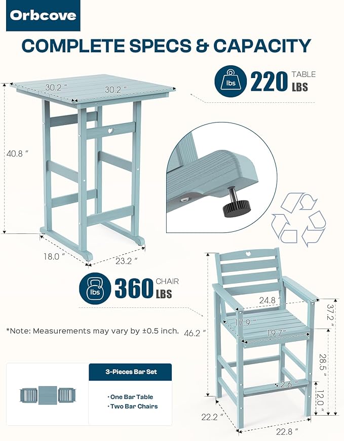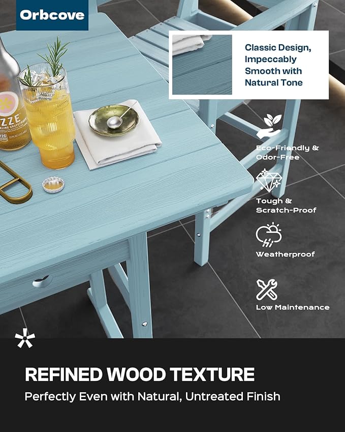 - Durable All-Weather Design: (Please note!!!Your order consists of two separate packages, which may be delivered at different times.) Crafted from HDPE with a natural wood grain finish, Orbcove bar table and chairs set withstands sun, rain, and wind without fading or cracking. Ideal for deck furniture, backyard furniture, or porch furniture, itβs perfect for year-round outdoor living.