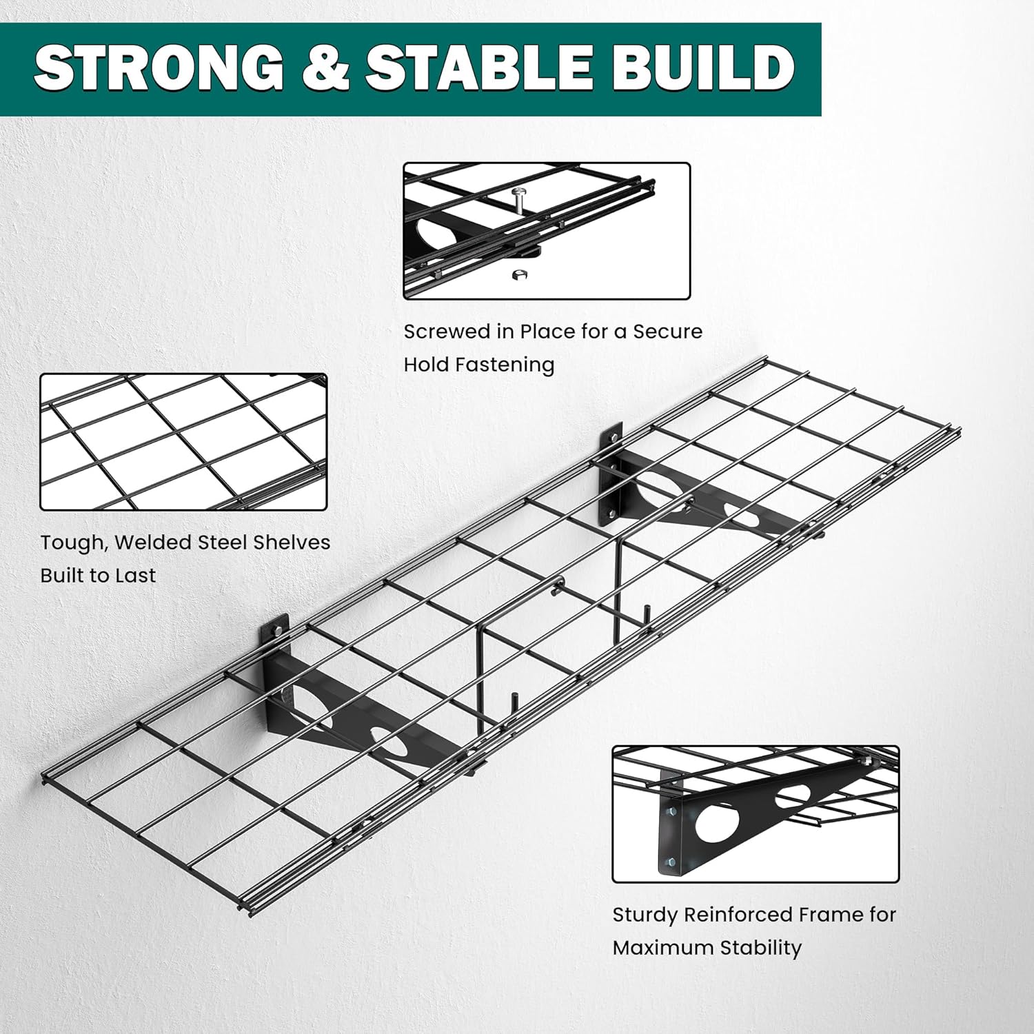 - RUST-PROOF COATED STEEL: Built to last, this wall-mounted shelf is made of high-quality powder-coated steel that resists rust, corrosion. Perfect for garage, basement, and laundry roomโeven in damp or harsh environment