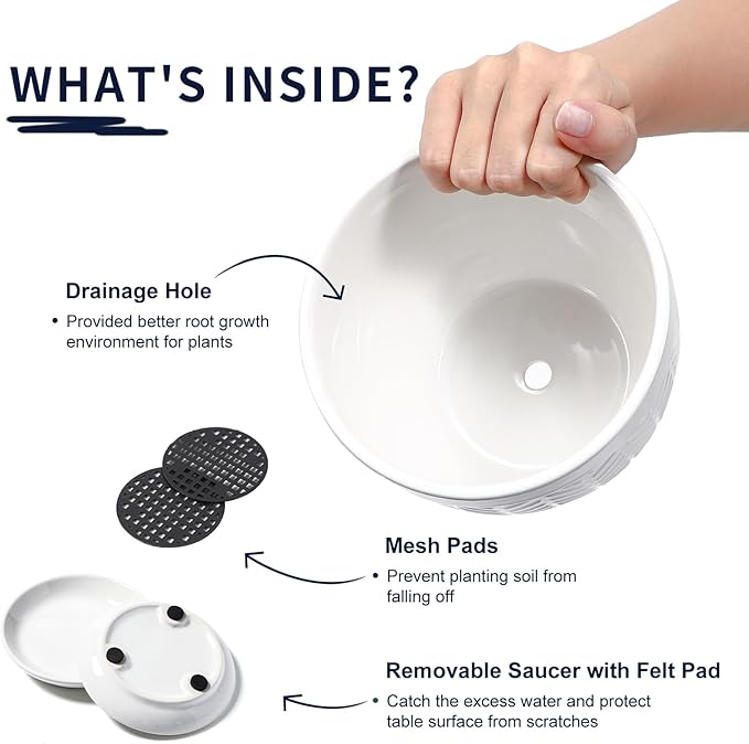 - Helps Plants Thrive: Our ceramic planters include mesh pads and drip trays; The saucers catch excess water, while the mesh pads prevent soil from clogging the drainage holes and keep them clear; This setup improves drainage and root healthβperfect for beginners who want their plants to grow strong and healthy