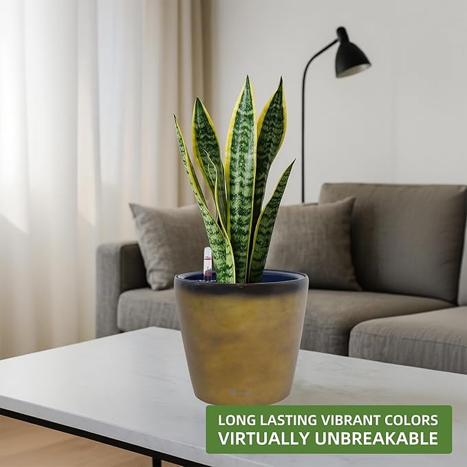 Dexceder 11x10 Inches Self Watering Planter Indoor Outdoor, Inner Pot Design, Thickened Table Flower Plant Pot with Water Level Indicator (Yellow Brown Gradient)