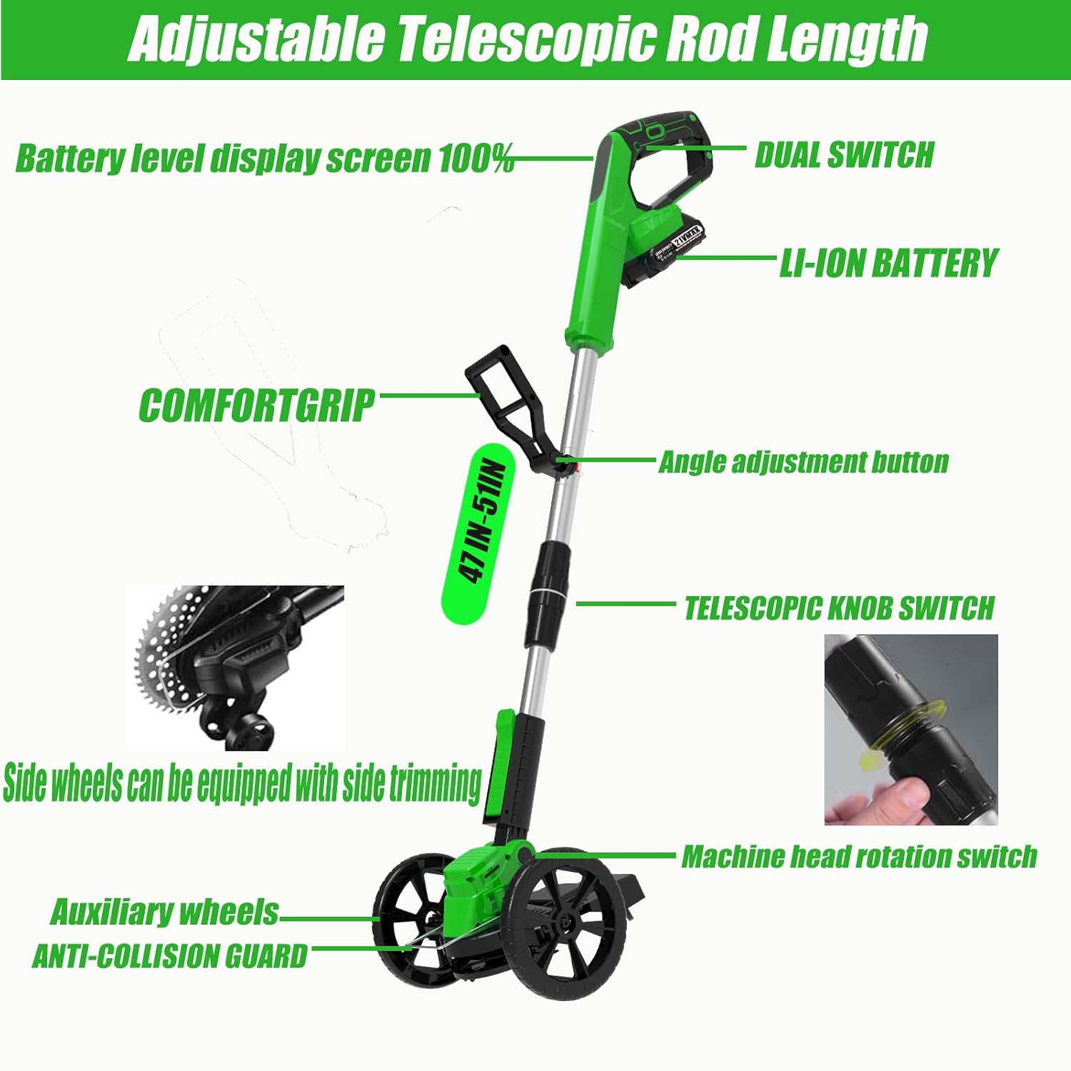 - ADJUSTABLE HEIGHT & ROTATING HEAD: The handle adopts ergonomic design Adjustable length of telescopic shaft which total length is about 41- 57inch, weight is only 4.5 pounds, The angle of the String Trimmer Cordless head can be adjusted (0-90°) at will to fit for most complex working environments. women and the elderly can easily use. allowing you to easily care for any hard-to-reach nooks and crannies