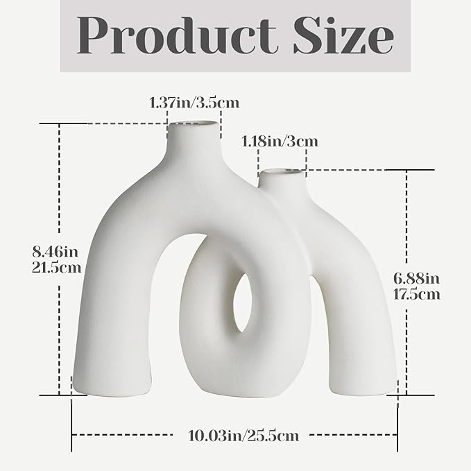 • SIZE & SET DETAILS Includes one white vase: Conjoined Size 10” × Heights 8.5" & 6.9". fits most stems. Boho-chic proportions ideal for shelves or tabletops.