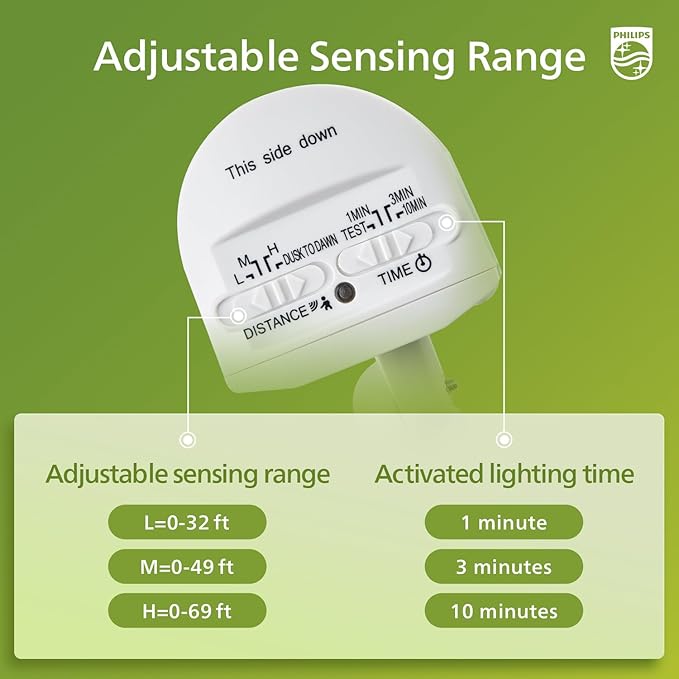 - HIGH-SENSITIVITY MOTION SENSOR - High-sensitivity passive infrared (PIR) motion sensor detects motion up to 69 ft away over a 180° angle; you can set light on time for 1, 3, or 10 mins.