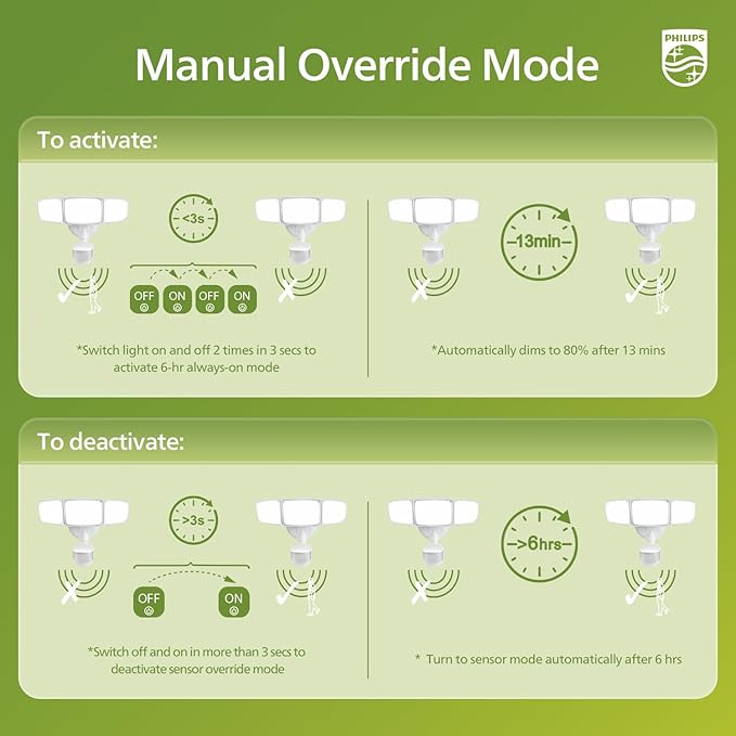 - 4 LIGHTING MODES - Test mode; security mode (with adjustable sensing range and light on time); dusk-to-dawn mode; manual override mode (always-on at 80% brightness for a maximum of 6 hours).