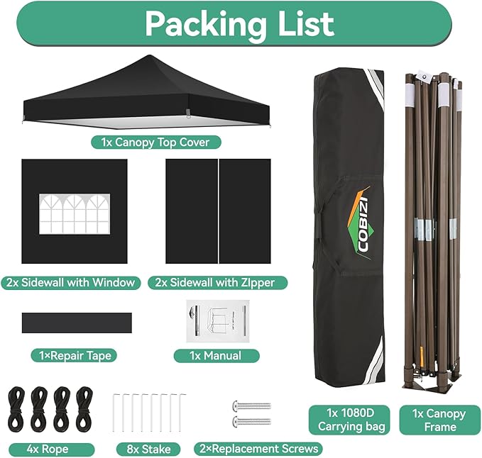 - [Included Accessories, Warranty Service] 1x Commercial Grade 10x10 Pop Up Tent Frame, 1x 420D Top Cover, 2x window sidewalls, 2x zipper door sidewall, 8x Ground Pegs, 4x Windproof Ropes, 1x Hand Bag, 1x Manual.We provide 1 year warranty service. If you have any problems and questions, please feel free to contact us, we will give you the best help. Choosing us means choosing a comfortable life.