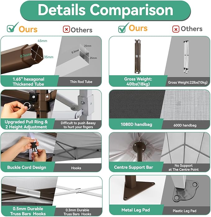 - [Upgrade Heavy Duty Canopy] The COBIZI 10x10 Heavy Duty Canopy features a commercial-grade full truss structure constructed from durable powder-coated stainless steel. The thickness of the 1.77 inch (45mm) hexagonal legs has been increased to 0.7mm/0.03 inches, providing superior stability and durability. Full truss design ensures exceptional sturdiness and rust resistance, capable of withstanding wind speeds of up to 30mph when properly secured with an number of ropes, and stakes.