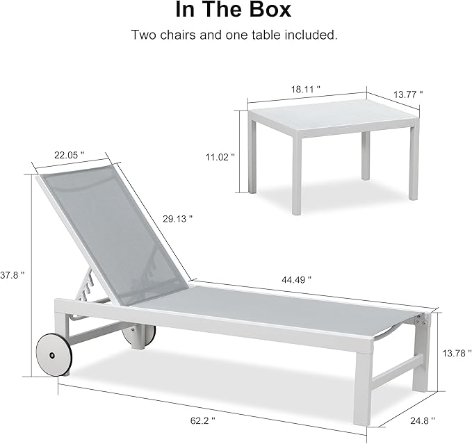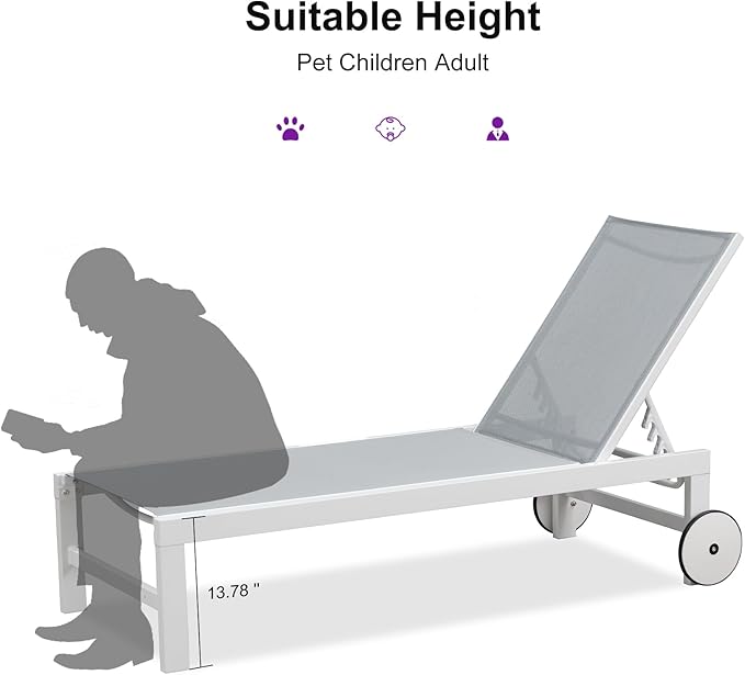 - White Aluminum Frame: The white chaise lounge offers superior sun protection; reducing heat absorption and maintaining a comfortable touch in any weather conditions; Additionally, it provides sturdy support with a maximum weight capacity of 270 pounds