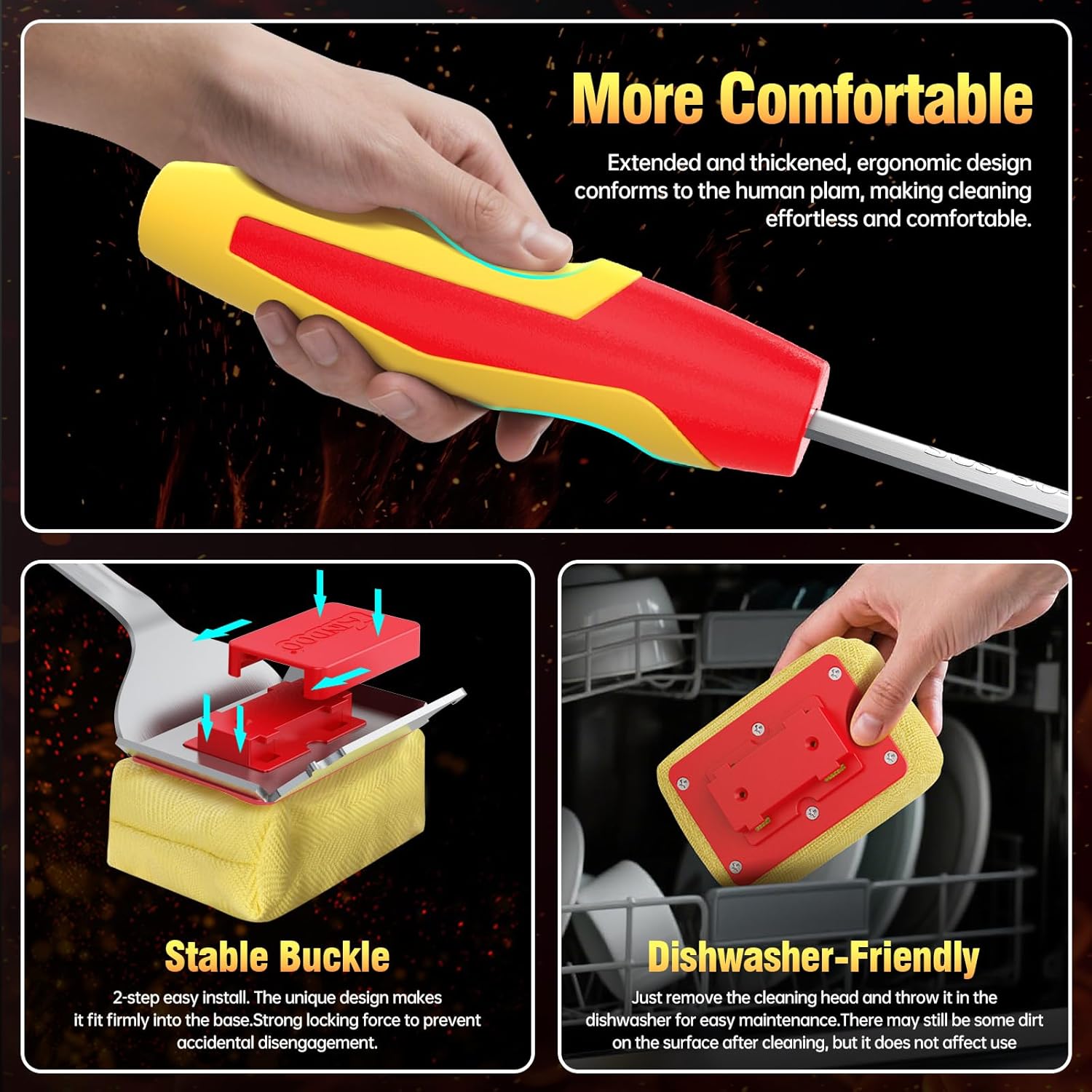 - 【Comfortable and Sturdy 】After multiple rounds of research and improvement, the ergonomic handle features a two-sided curved design and a thickened grip for a stronger grip that is comfortable and effortless. The extended handle and strong and flexible stainless steel handle never bends or break, keeping you away from the grill to avoid steam burns.The brush head for stainless steel grill brush is removable and features a safety clip mechanism for greater stability on the handle