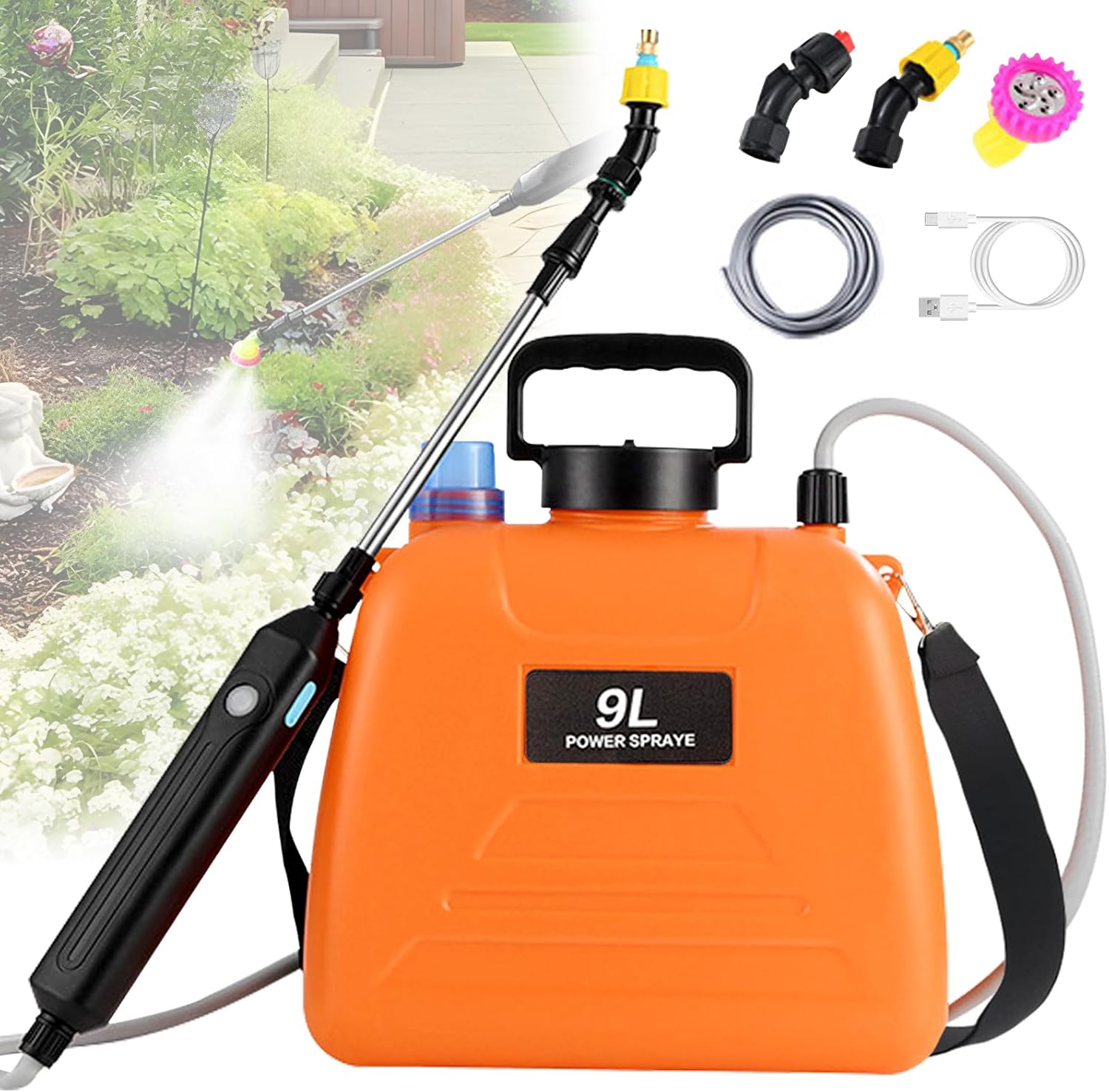2.4 Gallon Battery Powered Sprayer, Electric Battery Operated Sprayer, Weed Power Sprayers in Lawn and Garden with Adjustable Shoulder Strap and Rechargeable Handle, 3 Mist Nozzles (Orange)
