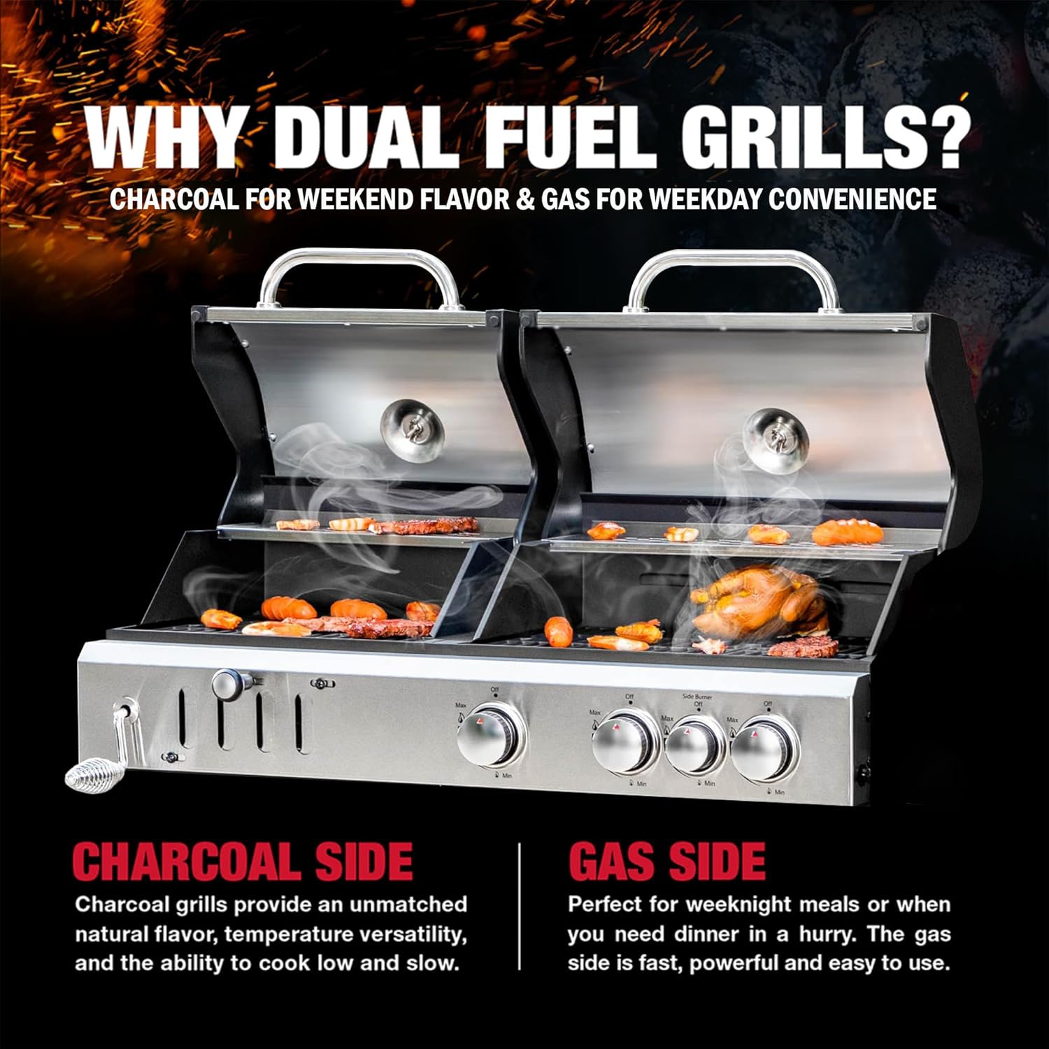 - COMBO GRILL: Gas and charcoal comb grill with additional side burner for ultimate cooking versatility. Can give you the rich, smoky flavor of charcoal or wood and the speedy convenience of gas in one tidy package. This dual fuel grill is a great option if you want to grill like a pro but canβt decide between a charcoal and a gas grill. You'll also conserve space on your porch or patio with one grill instead of two