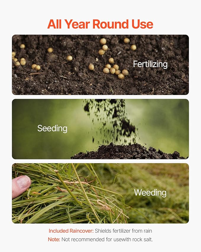 - All-Year-Round Versatility: Our garden seed spreader deal for spring seeding, summer fertilizing, and winter salting, replacing four tools with one. Suitable for home lawns and small farms.