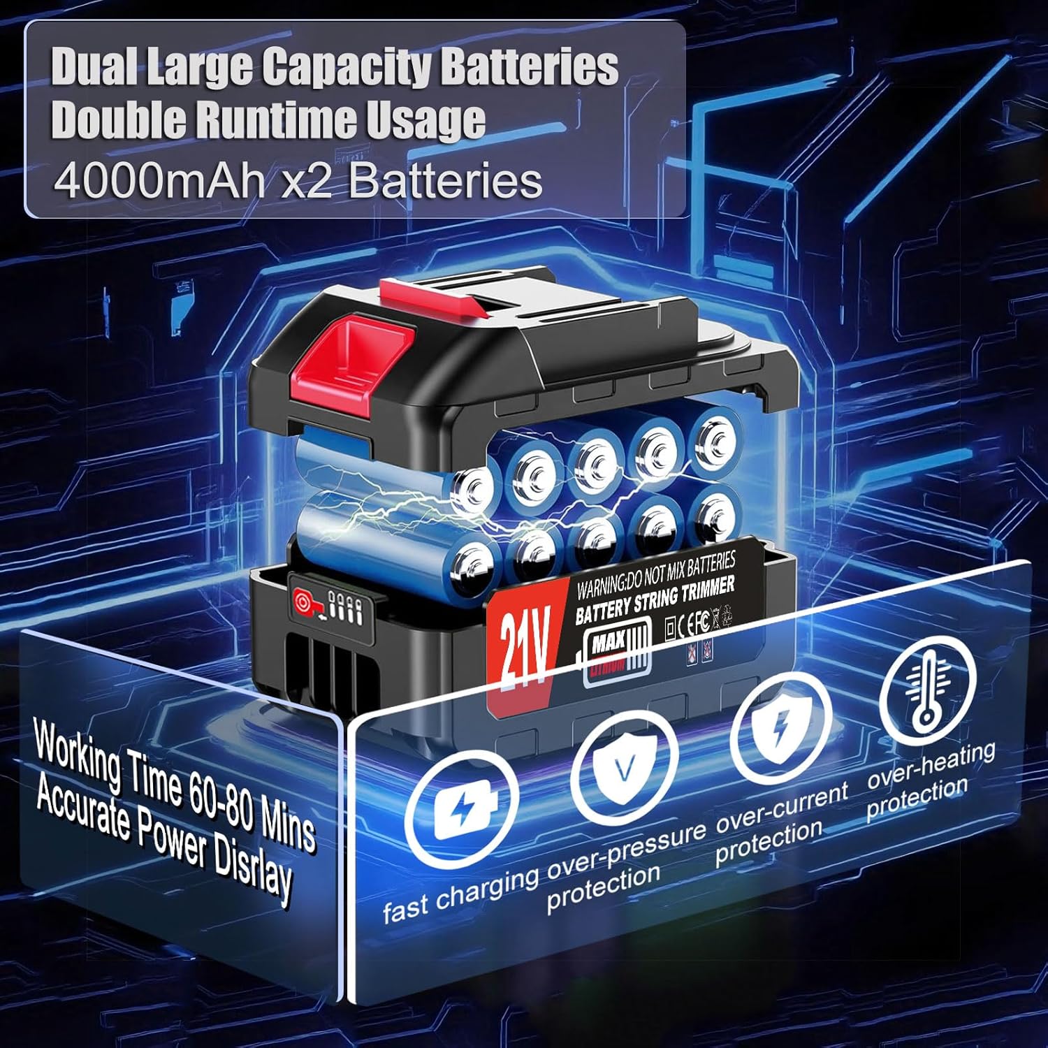 - 【2PCS HIGH CAPACITY BATTERY】The cordless weed wacker with 2*4000mAh high-capacity 21V lithium-ion battery to work in rotation, it is convenient for you to work for a long time, and the battery can work for 60-90 minutesweed wacker with longer run time, charging time (2-3 hours), You can use the 2 batteries alternately to provide continuous power for outdoor work. no longer stuck dragging an extension cord all over your lawn with the cordless no string weed wacker