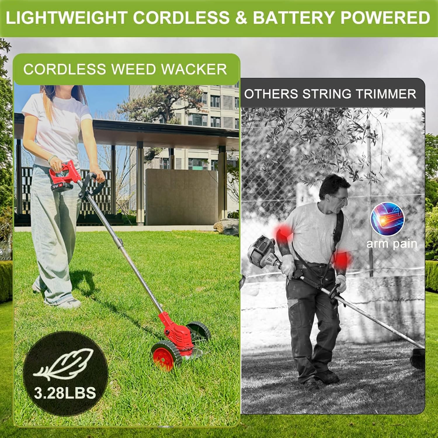 - 【Powerful Weed Wacker Battery Operated】The high-quality motor greatly improves the service life and operating power of the electric weed trimmer. Upgrade cordless grass trimmer with 800W high power motor, 18000 RPM no-load speed, achieve large operations under small machines. Multiple functions in one: grass trimmer, edger, lawn mower, easy for different cutting jobs, not limited by wires, you can mow anywhere