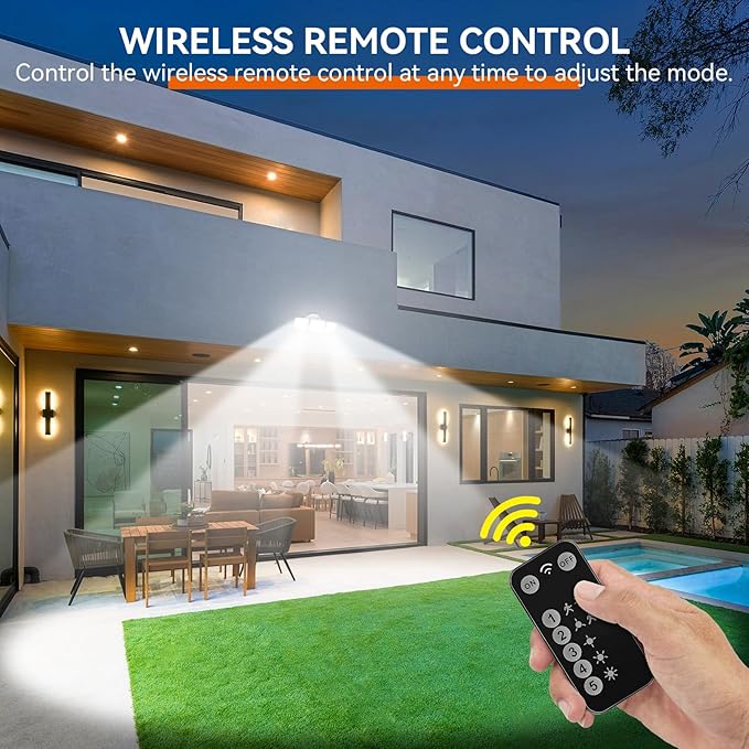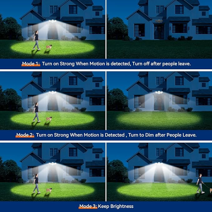 - ๐ ๐๐ข๐ ๐ก๐ญ๐ข๐ง๐ ๐๐จ๐๐๐ฌ ๐๐ฎ๐ญ๐๐จ๐จ๐ซ ๐๐ข๐ ๐ก๐ญ : The outdoor floodlight features four versatile lighting modes: โ Motion-activated at 100% brightness during the night; โก Dim light sensor mode โข Always-on at 30% brightness at night โฃ Stays on at 70% brightness at night โค Stays on at 100% brightness at night . These modes accommodate various usage scenarios, making it suitable for outdoor applications such as garages, yards, porches, pathways, driveways, and swimming pools