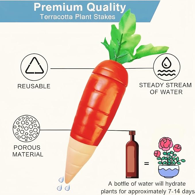 - Cute carrot shape: This plant terracotta watering stake is designed in a round and full carrot shape, with a few three-dimensional green leaves on the top, which instantly brightens the cuteness of the potted plants, full of natural childlike fun, making your plants more vibrant. It is not only a practical irrigation tool, but also a gardening ornament for windowsills and desktops