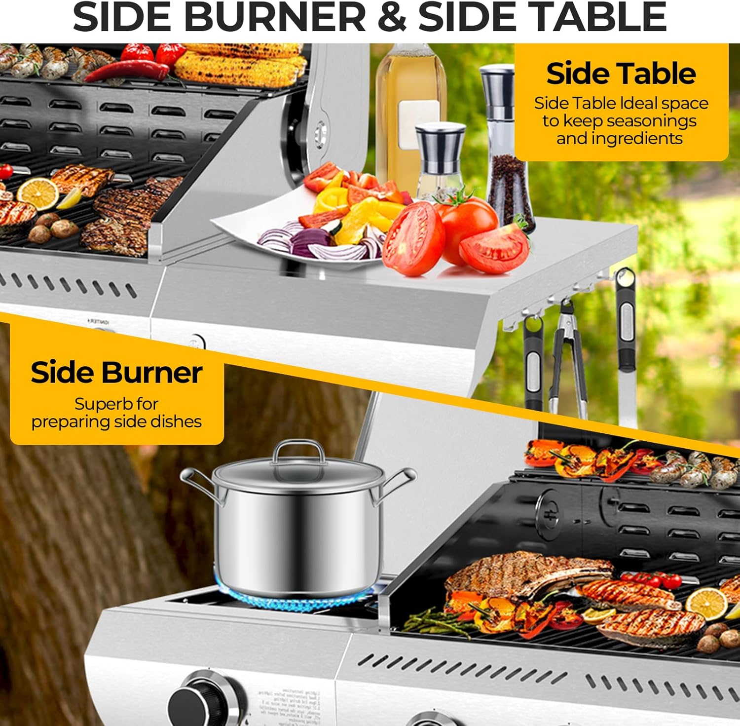 • 3-Burner + Side Burner System : Features three main burners (8,000 BTU each) and a 10,000 BTU side burner for versatile cooking (searing, simmering, or side dishes). Total 34,000 BTU output ensures fast heating and even heat distribution.
