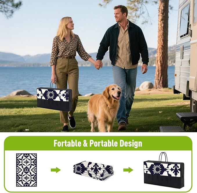 - Reversible Design: This double-sided patio rug features beautiful patterns on both sides, allowing you to quickly flip it over and instantly refresh your patio, porch, backyard, deck, RV campsite, or any outdoor space. A simple way to transform your style effortlessly