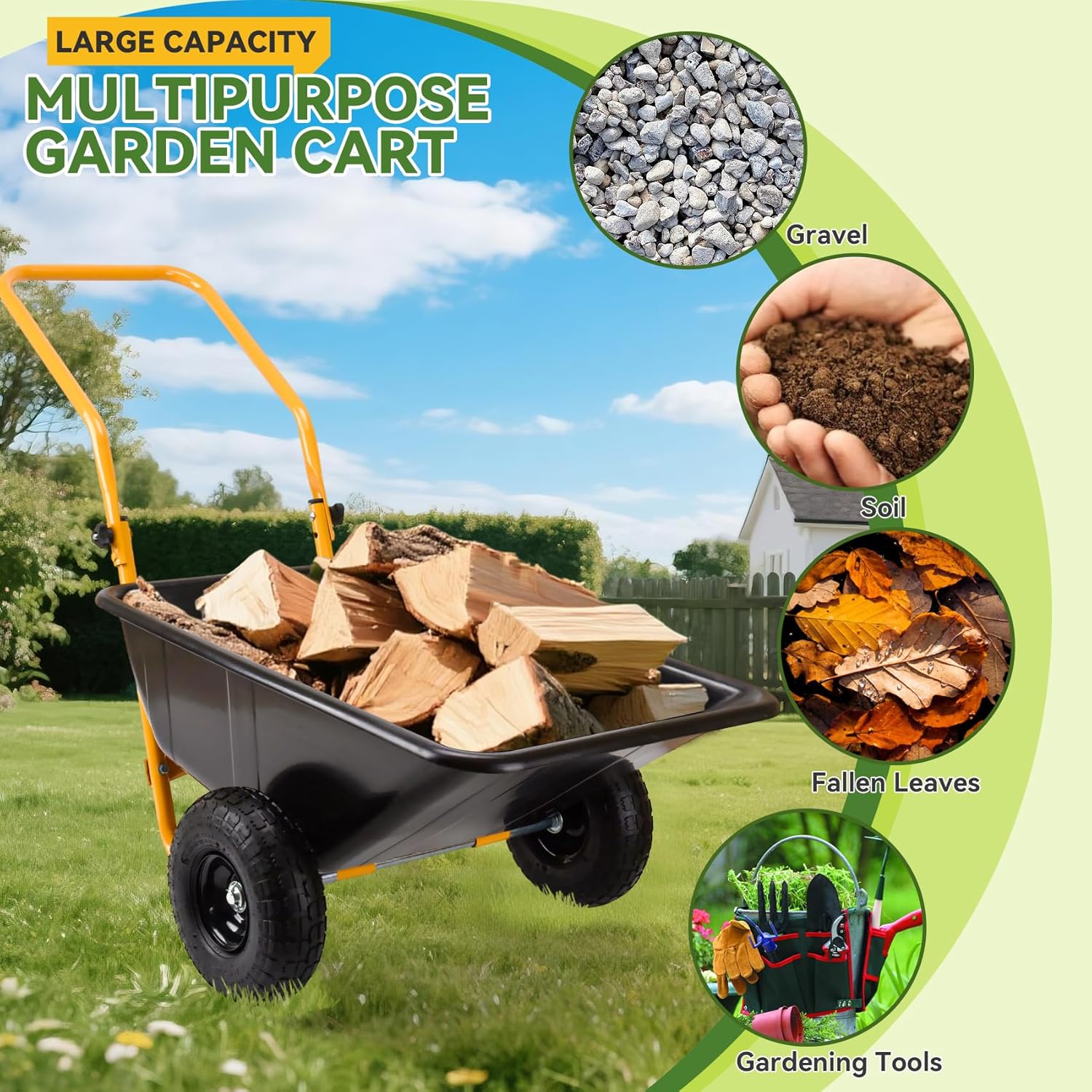 - Large 21-Gallon (80L) Volume for Bulk Hauling:With a spacious 21-gallon (80L) capacity,this wheelbarrow is perfect for transporting large quantities of mulch,firewood,gravel,or compost in a single trip.The deep,sturdy bin minimizes spillage,while the wide opening allows easy loading and unloading of bulky items.Ideal for landscapers,gardeners,and DIY enthusiasts.