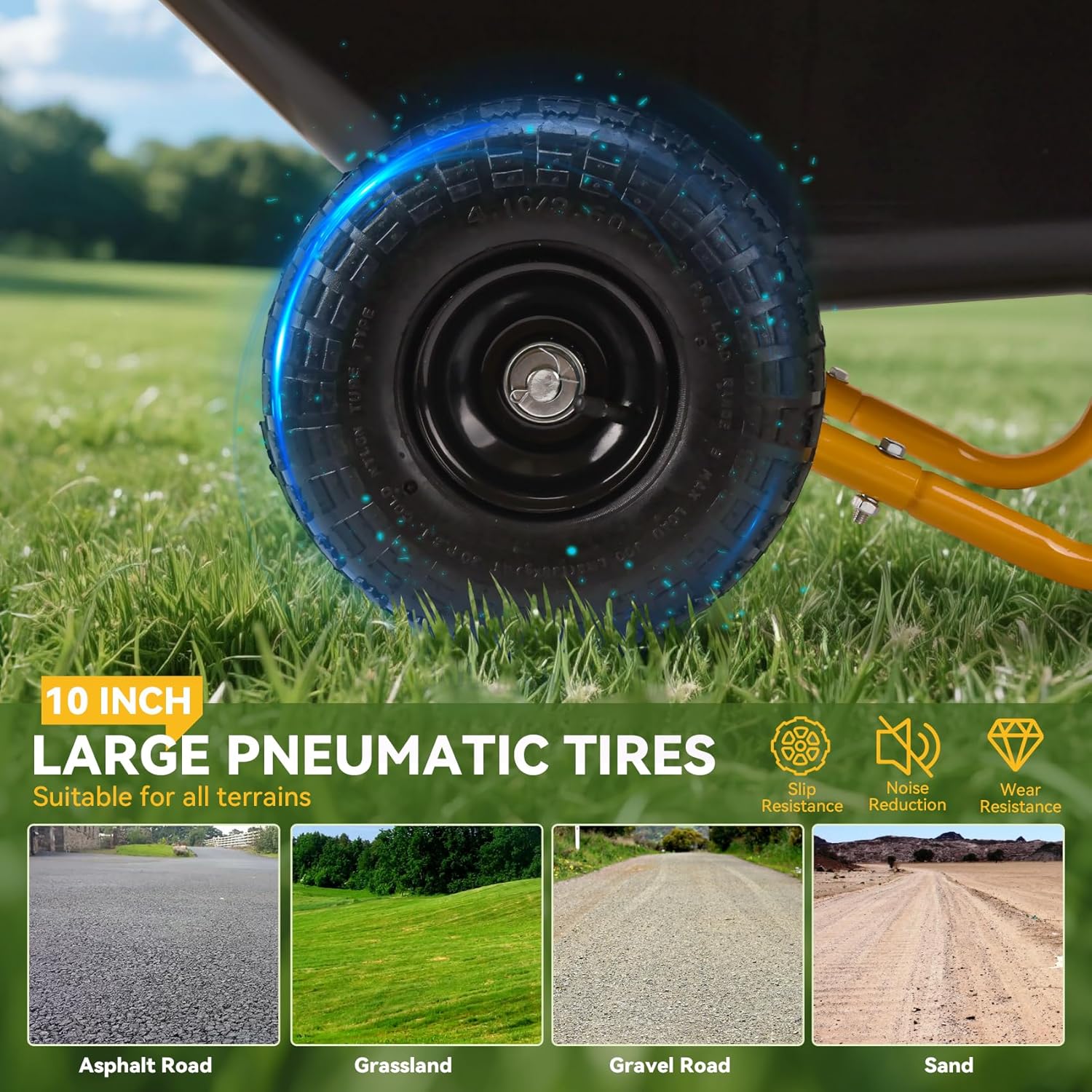 - Heavy-Duty Dual Pneumatic Wheels for Smooth Mobilit:Equipped with 10-inch (26 cm) pneumatic tires,this wheelbarrow ensures superior shock absorption and traction on rough terrains like gravel,sand,grass,and uneven pavement.The air-filled tires reduce noise and rolling resistance,making it effortless to transport heavy loads.The dual-wheel design enhances stability,preventing tipping even on slopes or bumpy ground.