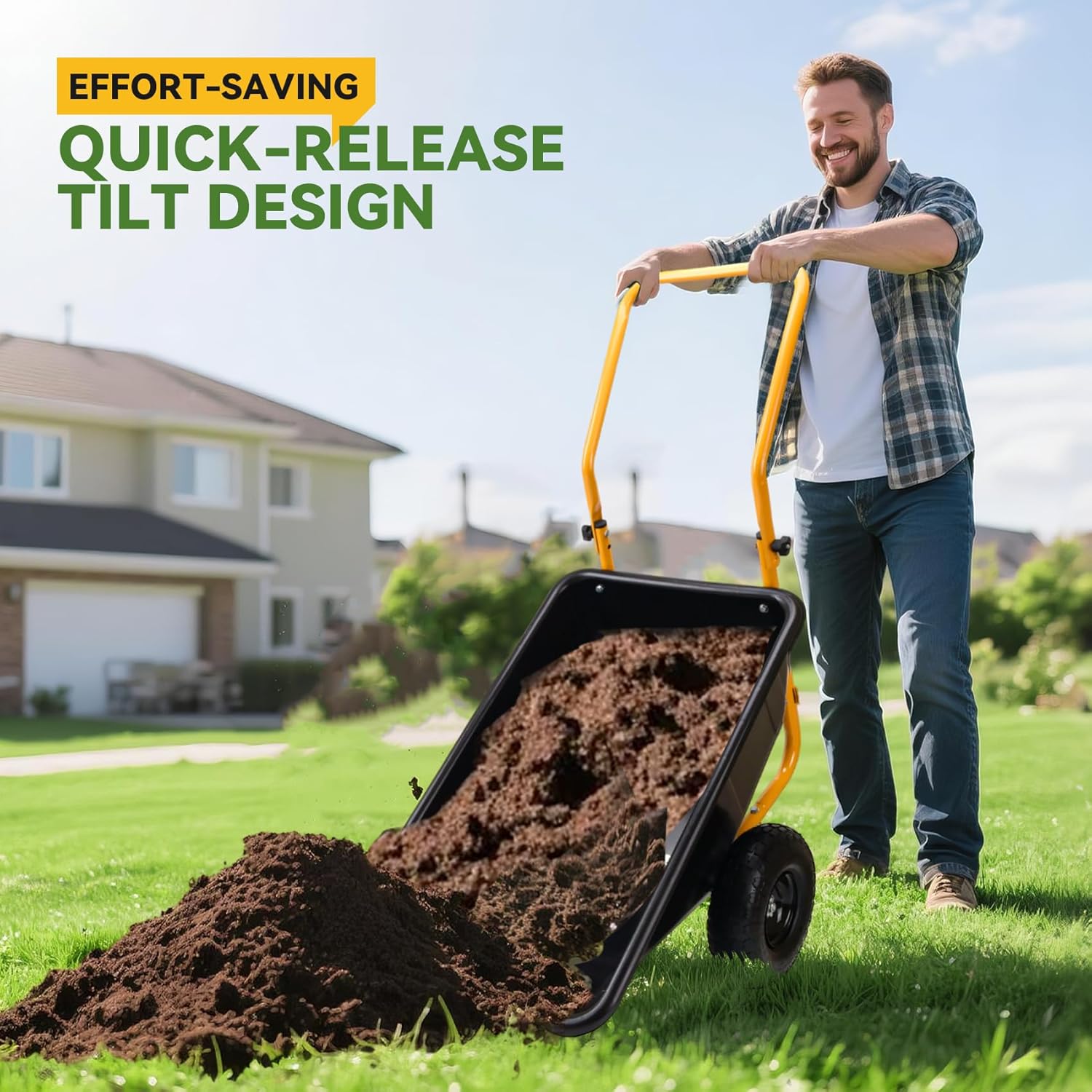 - Quick-Release Tilt Mechanism for Effortless Unloading:The one-handed quick-release lever enables smooth,controlled dumping of contents without heavy lifting.Simply pull the lever, and the bin tilts forward,making it perfect for repetitive yard work, construction sites,or farm use.The hassle-free design saves time and reduces physical strain.