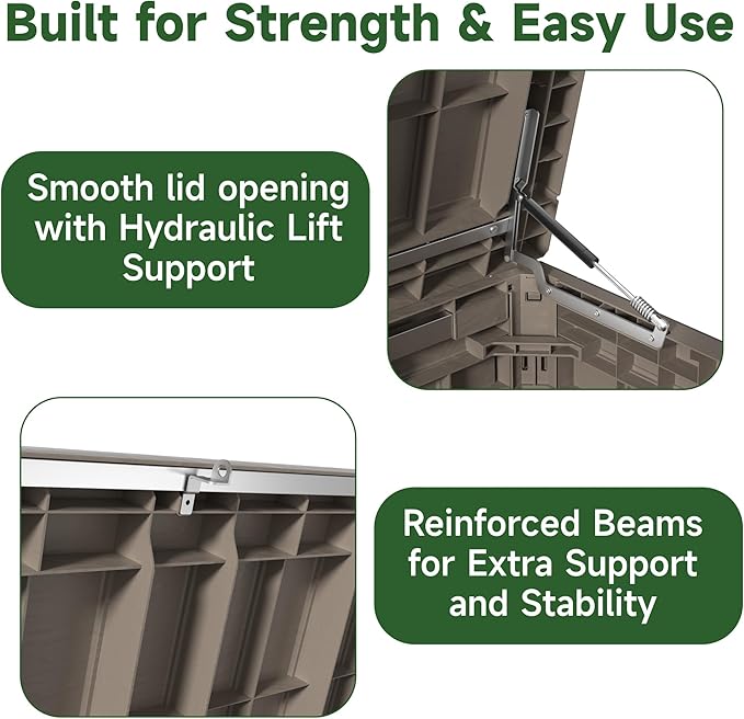 - ROBUST & STABLE DESIGN - Reinforced with metal rods and internal supports, this deck box can hold up to 880 lbs, providing exceptional durability. Its thicker panels and precise assembly ensure greater stability and help prevent deformation over time.