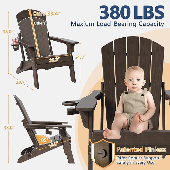 - Durable HDPE Material–Built to Withstand the Elements: Made from high-density polyethylene (HDPE), this Adirondack chair offers superior resistance to weather, fading, and cracking. Unlike wood, it won't rot, peel, or splinter, making it ideal for year-round outdoor use with virtually no maintenance required.