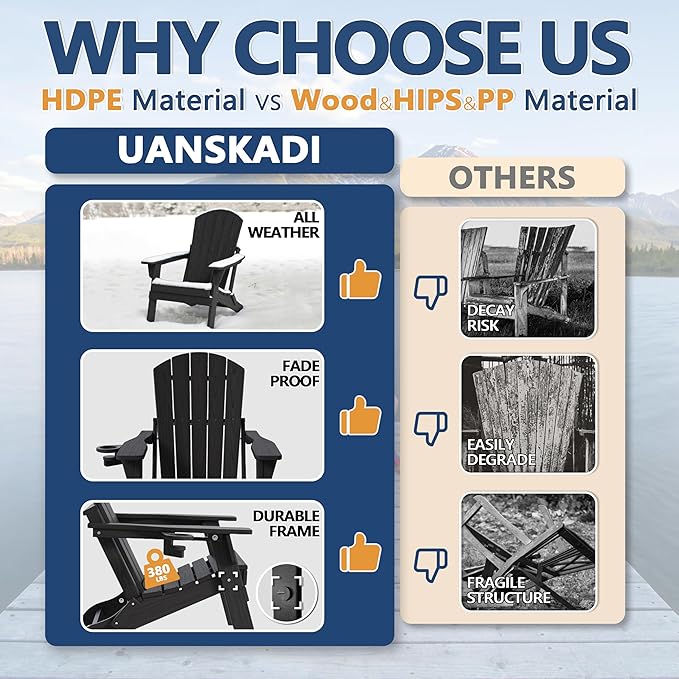 - Durable HDPE Material–Built to Withstand the Elements: Made from high-density polyethylene (HDPE), this Adirondack chair offers superior resistance to weather, fading, and cracking. Unlike wood, it won't rot, peel, or splinter, making it ideal for year-round outdoor use with virtually no maintenance required.