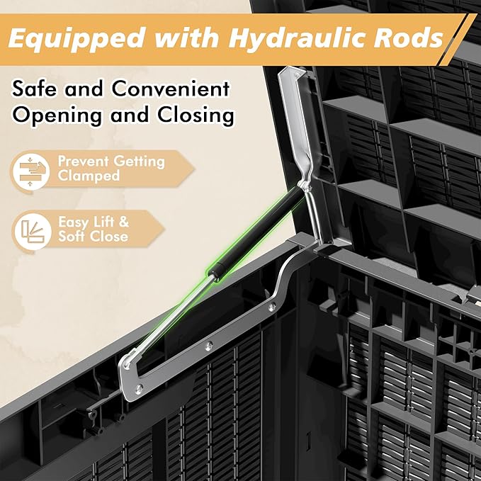 - 👍 Hydraulic Lid with Lockable Design for Safe Access Equipped with hydraulic gas lift rods, the lid opens smoothly and closes gently to prevent pinched fingers. The lockable lid adds an extra layer of security, making it an ideal choice for shared outdoor spaces or secure backyard storage. (Lock not included)