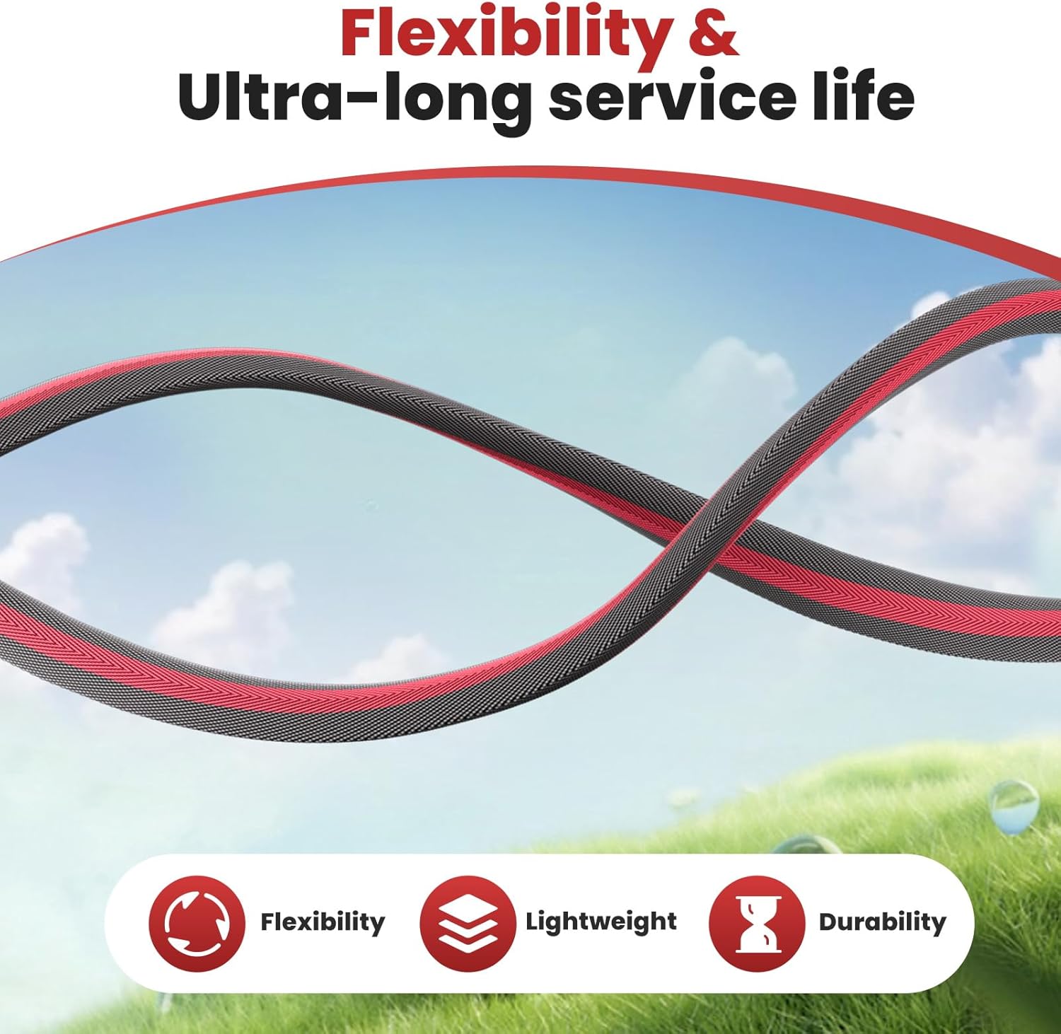 - 🚀 Ultra-Durable 8-Layer Latex Core – Reinforced with high-density polyester mesh and 2X latex layers, this non-expanding garden hose resists leaks, cracks, and bursts under 150-450 PSI, lasting 3X longer than standard hoses.