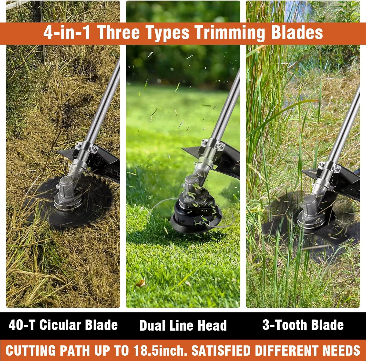 - 4 in 1 Multi-function: With 4 detachable trimming heads, including two 9.8-inch string trimmer heads, one 18.5-inch 3-T blade and one 18.5-inch 40-T circular blade, the wide cutting path can cover a lot of ground in a single pass. This makes it great for large yards or areas that need to be cleared quickly. Switch your trimmer head to tackle any type of grass or weeds.