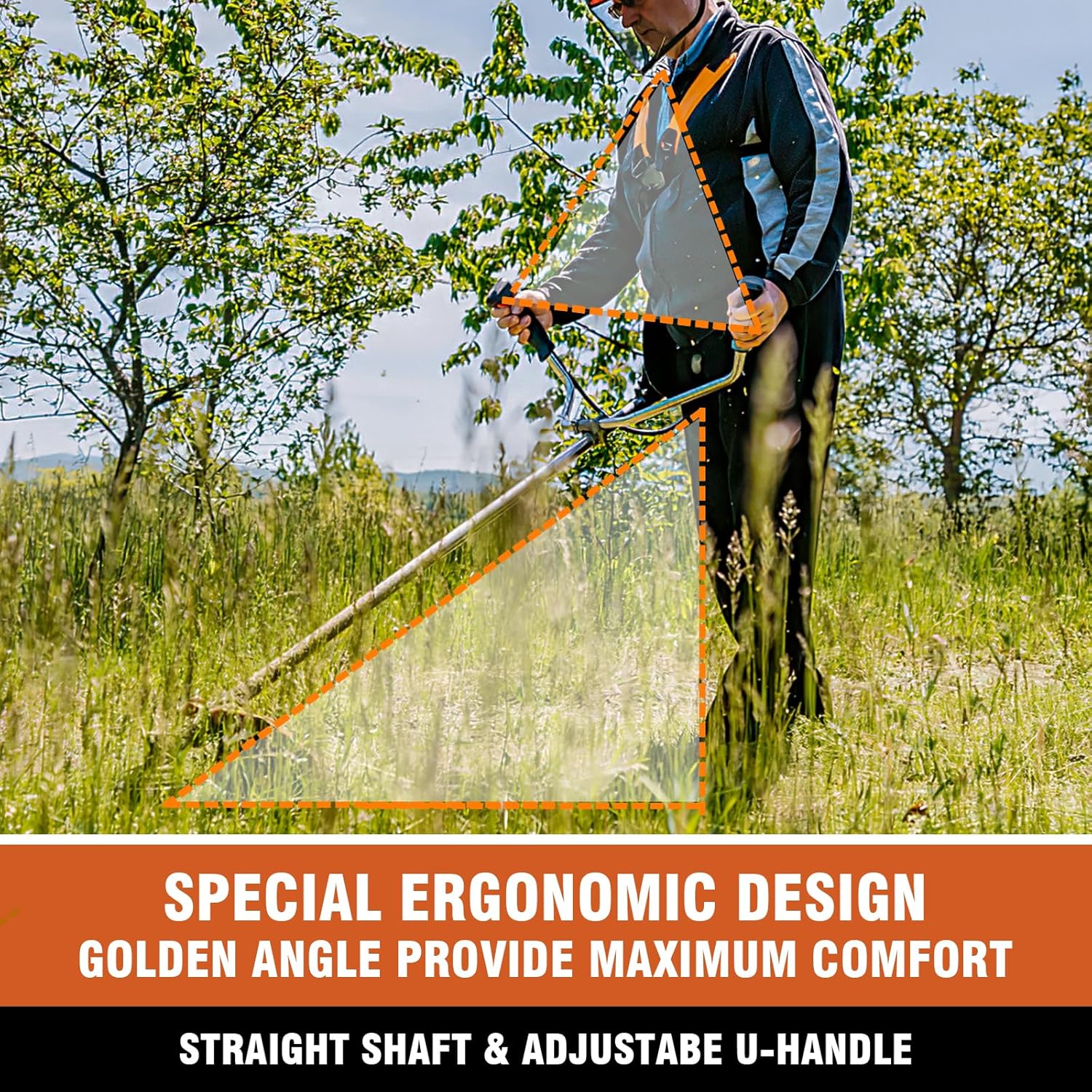 - Ergonomic & Labor-Saving: This gas powered brush cutter is designed with user-friendly features, making it easy to start, reload the spool, and perform routine maintenance. The two-hand control ensures anti-slip grip and balanced weight distribution. This means you can spend less time fussing with your equipment and more time getting your yard looking great.