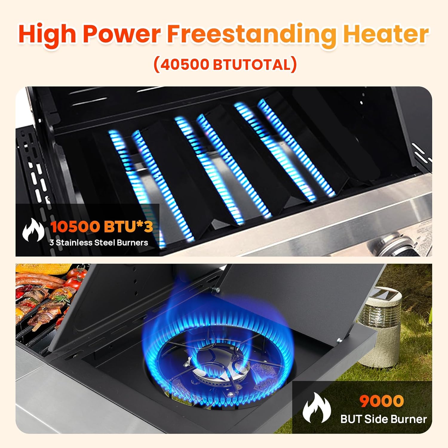 - π₯ High-Performance Stainless Steel Burners - This propane gas grill features 3 powerful stainless steel burners and side burner delivering a total of 40,500 BTU per hour. With a built-in piezoelectric ignition system, you can enjoy instant start-upβjust push and turn the control knob. Itβs reliable, efficient, and ready to fire up your outdoor meals in seconds.