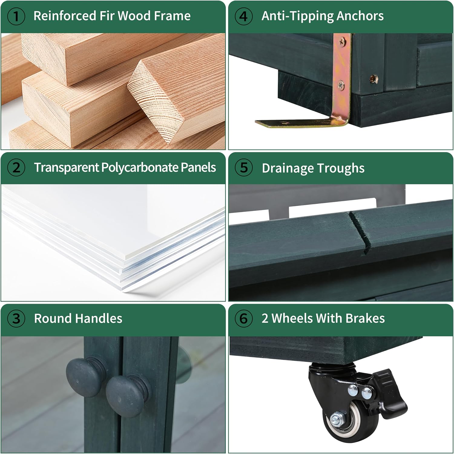- Mobility & Smart Ventilation – Features 2 removable wheels with brakes and anti-tip anchors for easy relocation and stability. The adjustable roof with drainage troughs prevents waterlogging, while dual front doors provide full plant access.