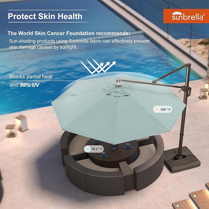- This cantilever umbrella has unique handle design with 5 tilt positions, and 360° rotation allowing smooth adjustment to the sun's changing angles.