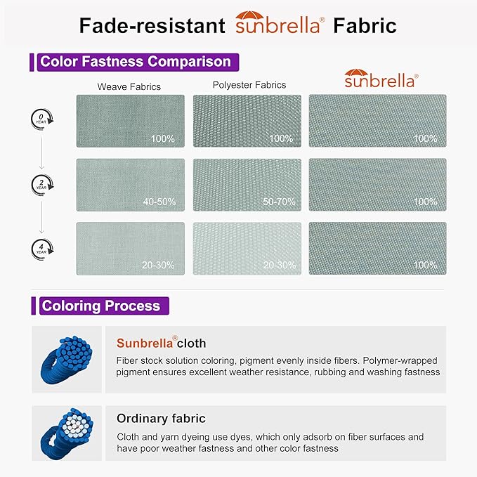 - Fabrics superior to regular fabrics, 5 years colorfast, water-repellent, quick to dry and easy to care for without fear of colour loss or degradation